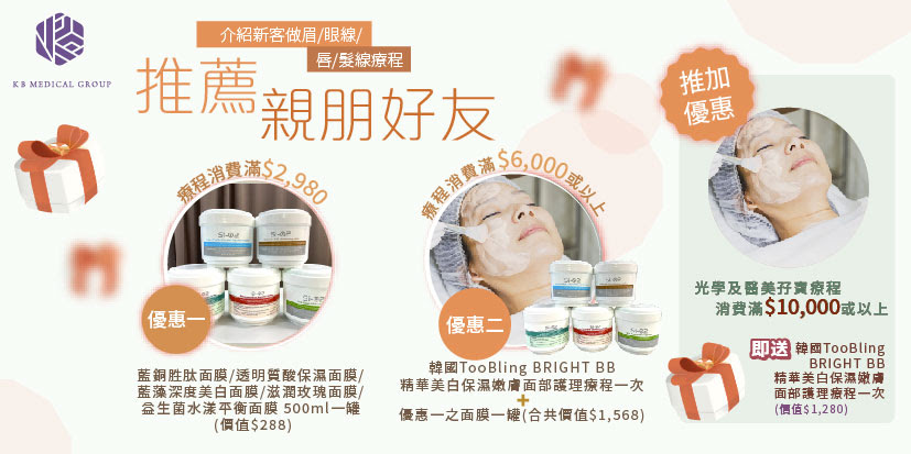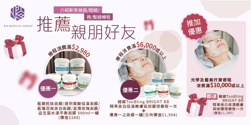 介紹新客來做眉,眼線,唇,髮線療程消費滿$6,000 即送贈 藍銅胜肽面膜/透明質酸保濕面膜/藍藻深度美白面膜/滋潤玫瑰面膜/益生菌水漾平衡面膜 500ml一罐 (價值$288)及 韓國TooBling BRIGHT BB精華美白保濕嫩膚護理面+頸療程一次 (價值$1,280) (合共價值$1,568) !